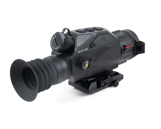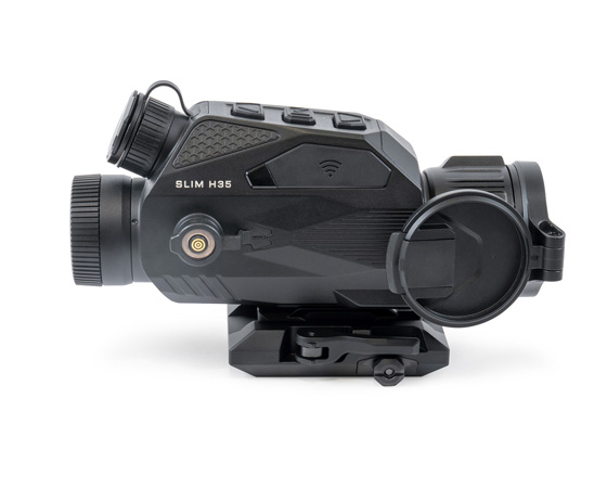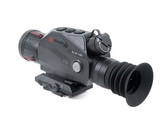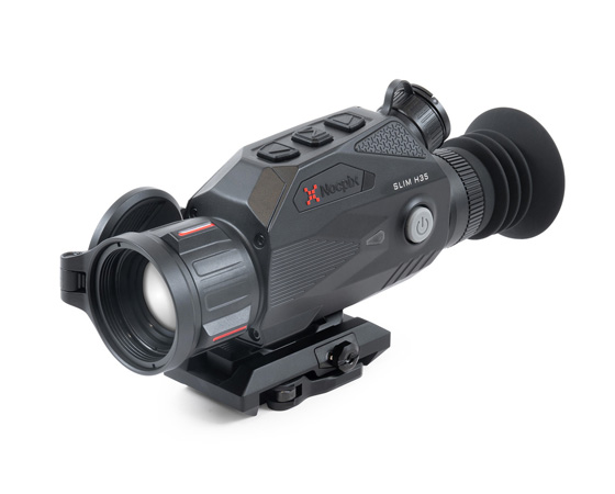 The new SLIM series from Nocpix provides the best value and features in a compact optic. Focused on versatility and ease of use, SLIM models can be used as either a handheld monocular or a weapon sight. With the included proprietary quick-detach mounting system a hunter can quickly scan and then re-attach the optic to the rifle while maintaining zero. A magnesium alloy body and quiet, soft-touch buttons provide excellent ergonomics in both handheld and weapon-mounted configurations. The included IRB-2 batteries (flay-top 18650 style cell) are easy to swap–letting you stay out longer with the ability to charge through the optic using a magnetic cable. Generous eye relief and a 1024×768 AMOLED display provide a comfortable and highly detailed viewing and hunting experience.